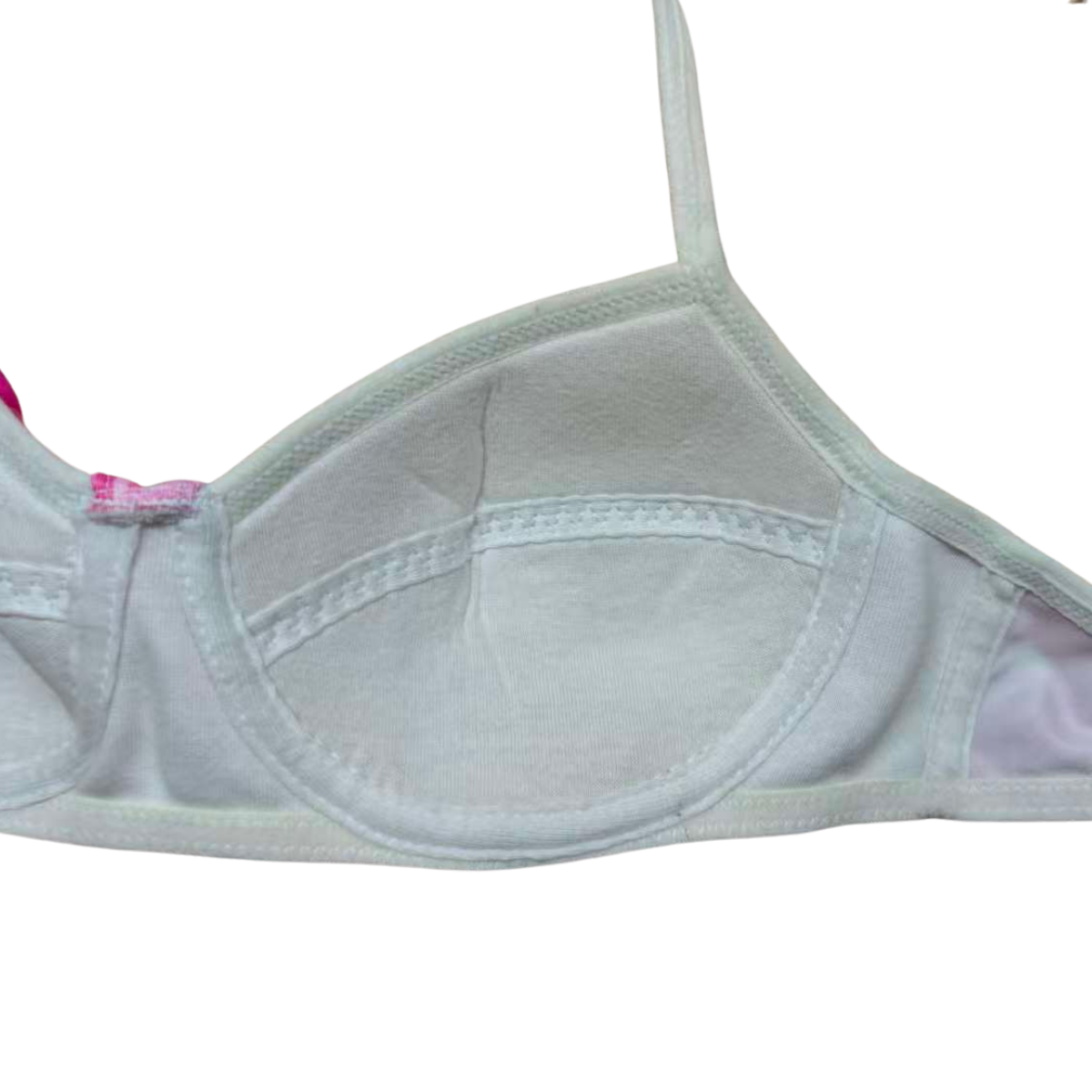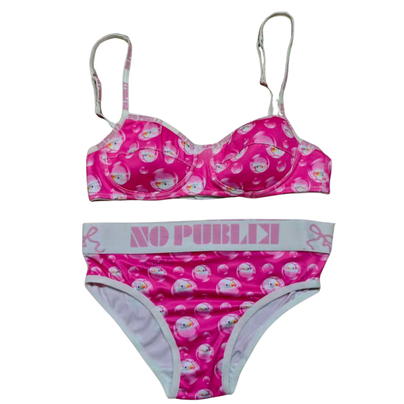 This two-piece girls' underwear set combines a comfortable bralette with matching high-waist briefs, featuring a playful pink bubble and character print. Engineered for active daily wear, the set utilizes high-stretch fabric to ensure a secure yet non-restrictive fit for growing children. Our factory provides full OEM support, allowing brands to implement custom elastic branding and unique sublimation patterns across the entire garment.
